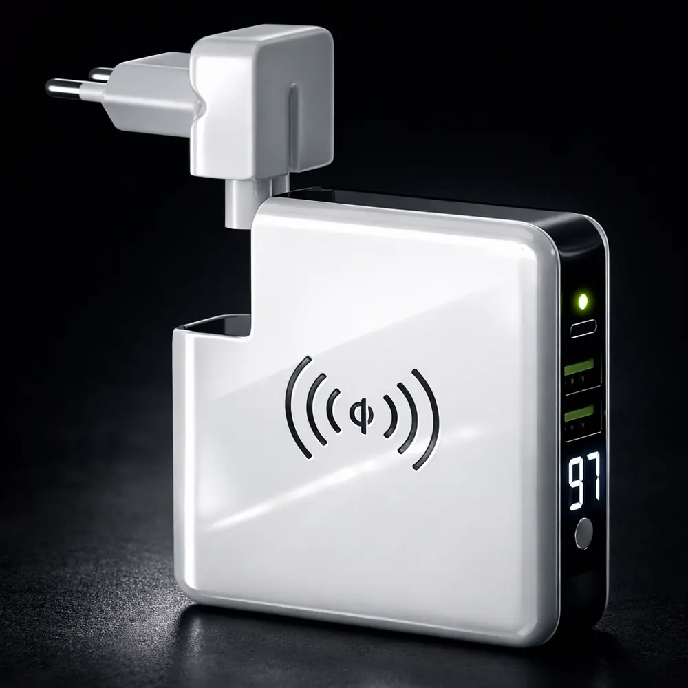 Este no es un cargador portátil común. Es tu estación de energía personal que te sigue a donde vayas, combinando tres dispositivos esenciales en uno solo: power bank, cargador de pared y base de carga inalámbrica.