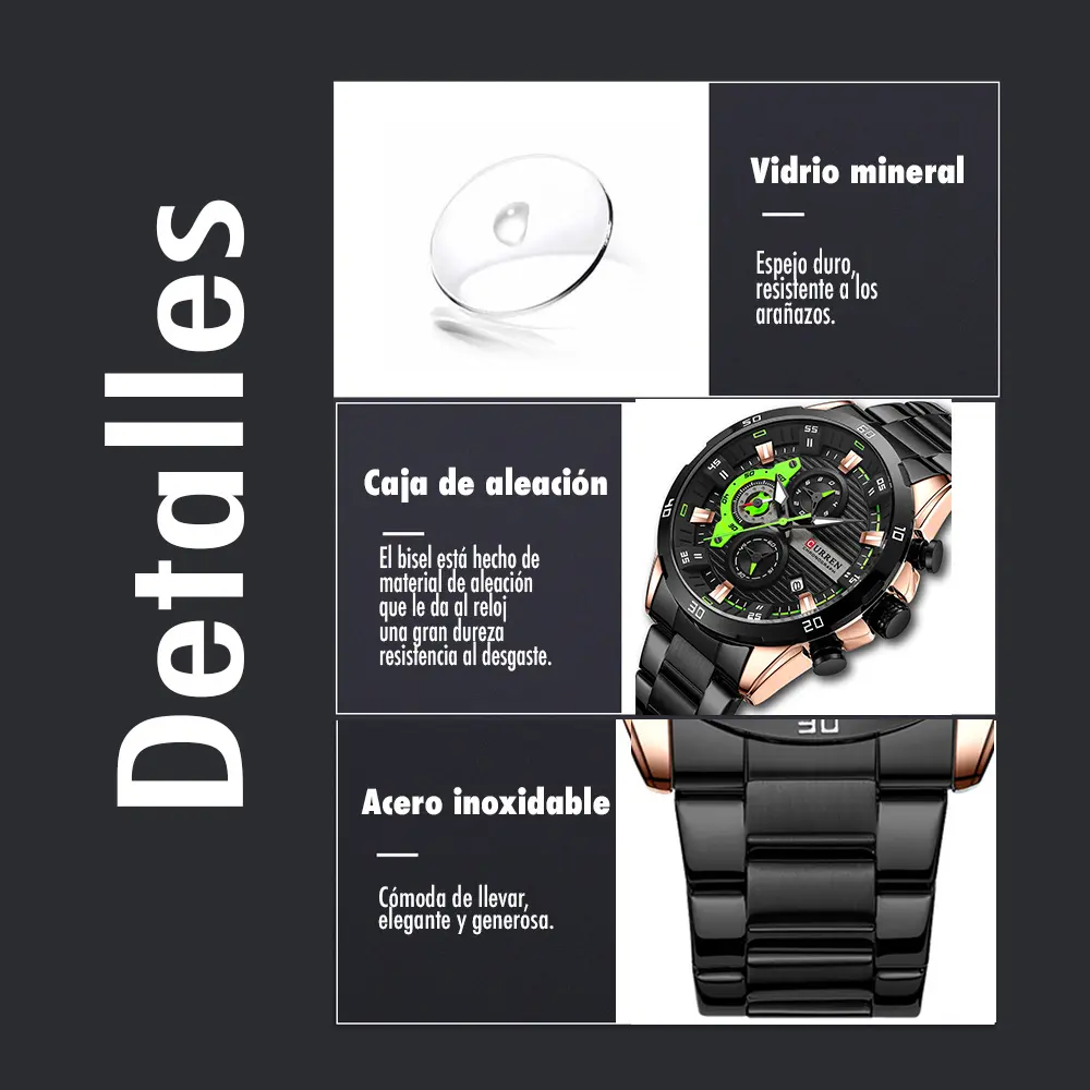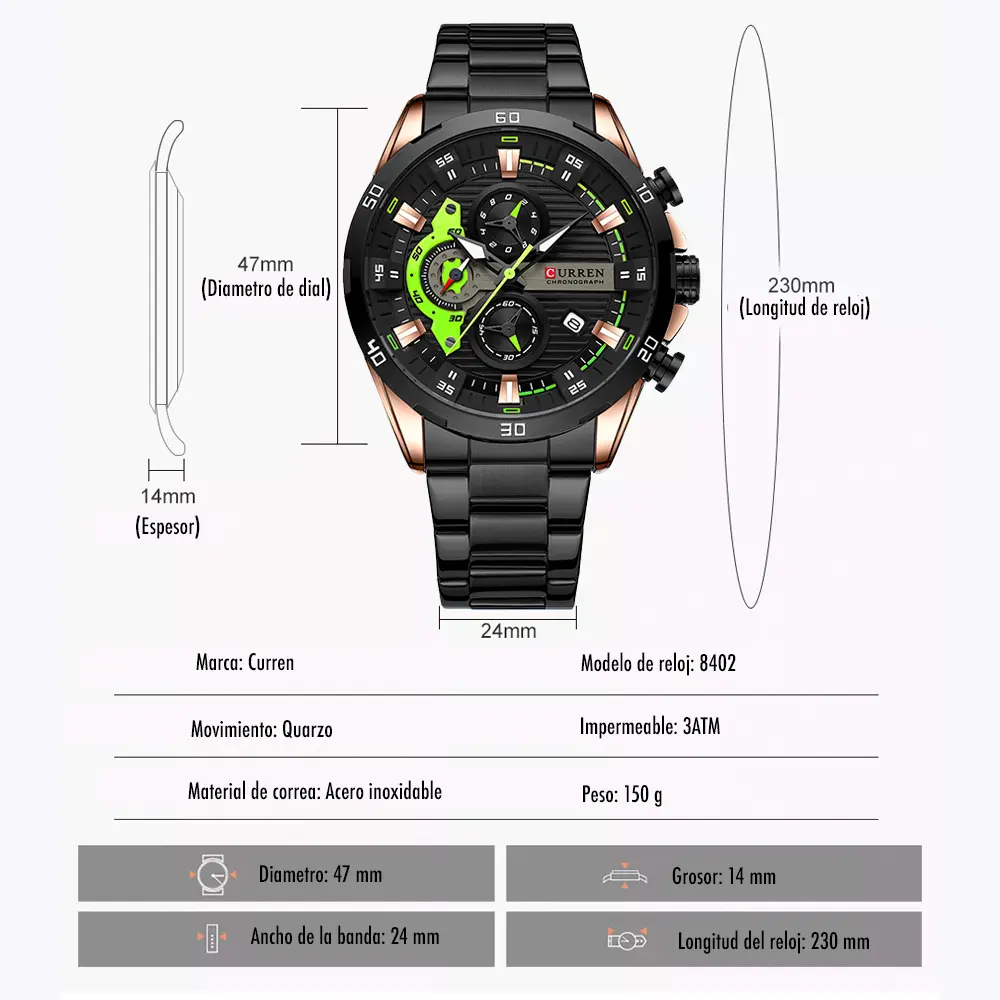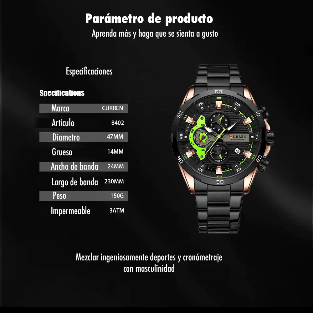 Curren y el modelo 8402 son marcas registradas. Producto distribuido oficialmente por Curren Latam. Precios en pesos colombianos (COP). Disponibilidad sujeta a stock. Resistencia al agua 30m: apto para salpicaduras, NO para natación. Garantía de 12 meses contra defectos de fabricación. No cubre daños por mal uso. Para ajuste de correa, acudir a relojería autorizada.