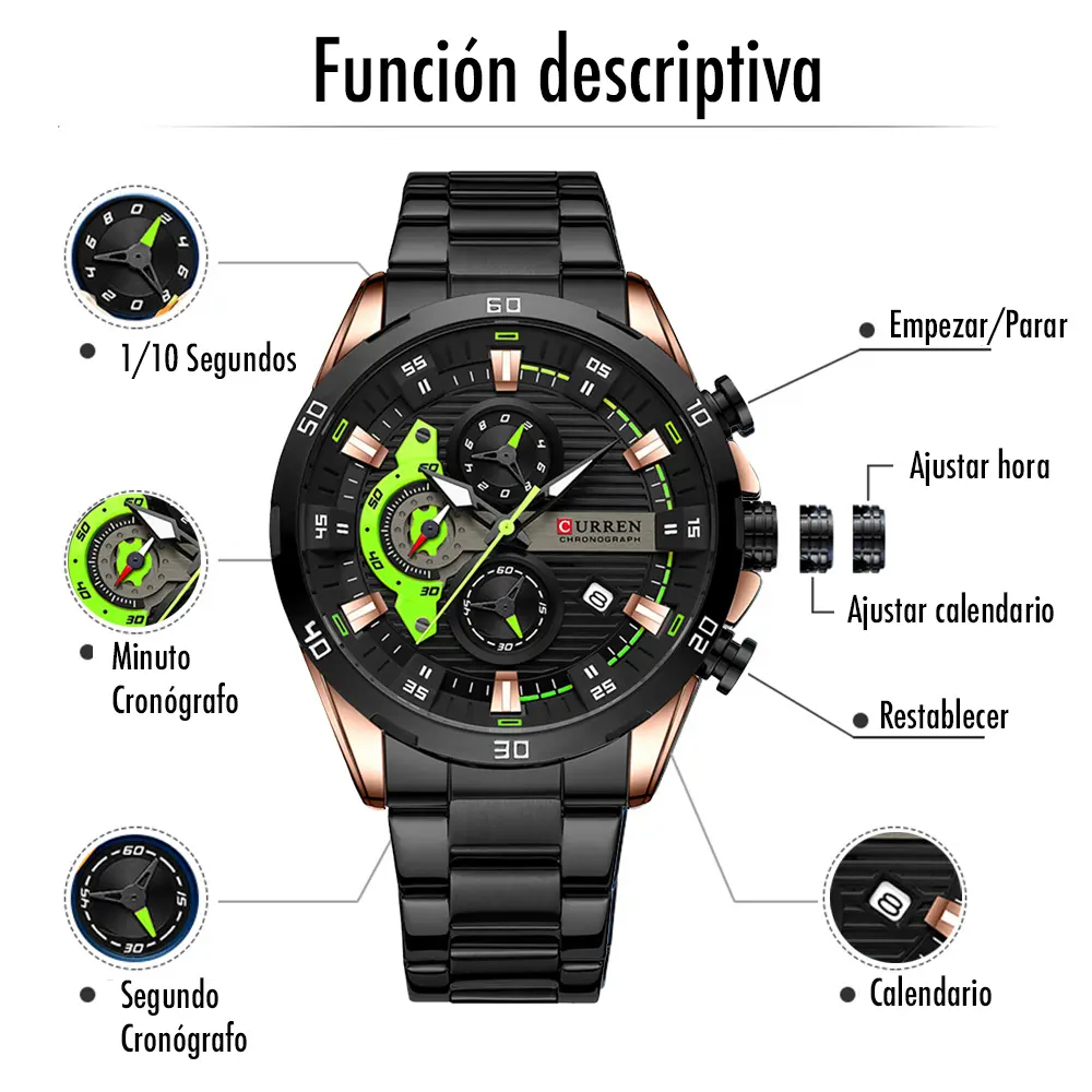 ✨ Funcionalidades • Cronógrafos funcionales (segundero, minutero, 24h) | 🎨 Diseño • Material caja/correa: Acero inoxidable |